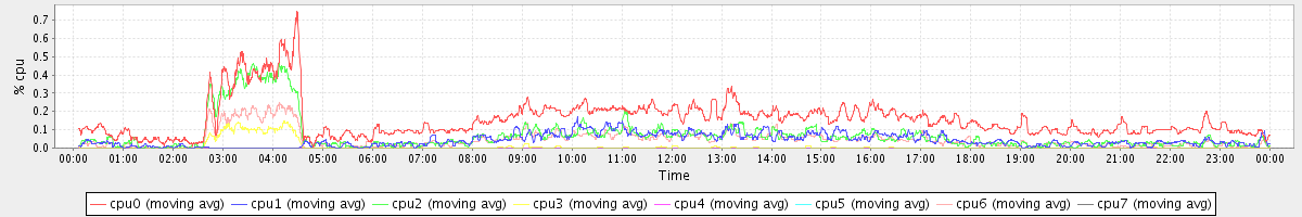 avg(cpu0) = 1.45 avg(cpu1) = 0.44 avg(cpu2) = 0.45 avg(cpu3) = 0.37 avg(cpu4) = 0.33 avg(cpu5) = 0.37 avg(cpu6) = 0.41 avg(cpu7) = 0.36