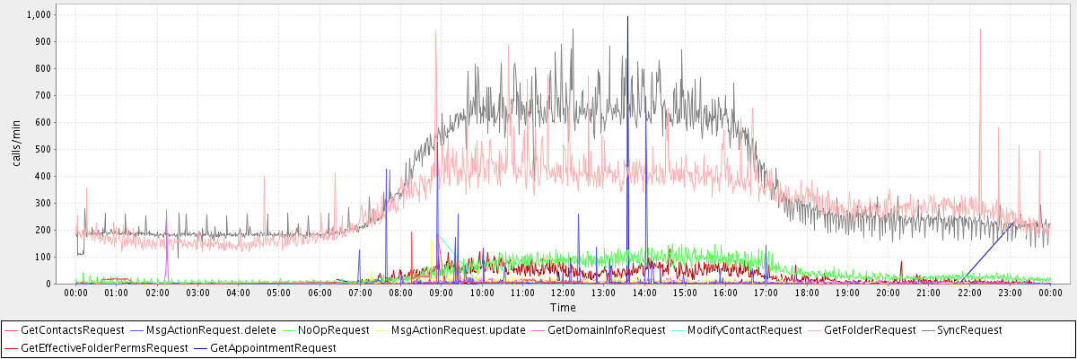 max(GetContactsRequest) = 194.00 max(MsgActionRequest.delete) = 698.00 max(NoOpRequest) = 151.00 max(MsgActionRequest.update) = 160.00 max(GetDomainInfoRequest) = 272.00 max(ModifyContactRequest) = 187.00 max(GetFolderRequest) = 946.00 max(SyncRequest) = 949.00 max(GetEffectiveFolderPermsRequest) = 132.00 max(GetAppointmentRequest) = 993.00