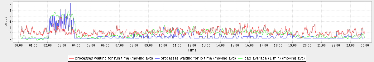 avg(processes waiting for run time) = 1.45 avg(processes waiting for io time) = 0.46 avg(load average (1 min)) = 1.92