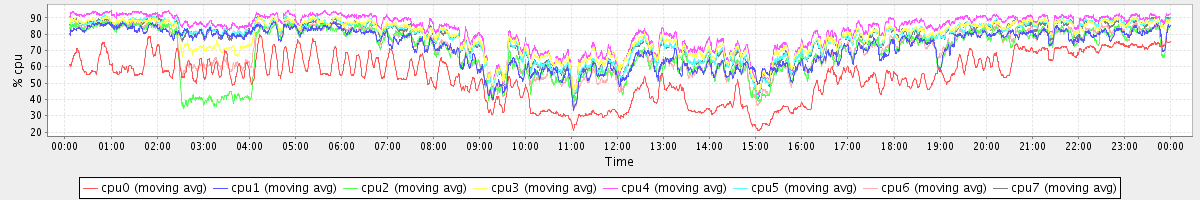 avg(cpu0) = 41.11 avg(cpu1) = 18.30 avg(cpu2) = 17.98 avg(cpu3) = 17.28 avg(cpu4) = 14.72 avg(cpu5) = 18.68 avg(cpu6) = 19.52 avg(cpu7) = 19.30