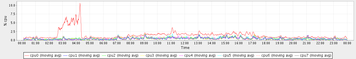 avg(cpu0) = 1.48 avg(cpu1) = 0.47 avg(cpu2) = 0.49 avg(cpu3) = 0.41 avg(cpu4) = 0.36 avg(cpu5) = 0.41 avg(cpu6) = 0.45 avg(cpu7) = 0.38