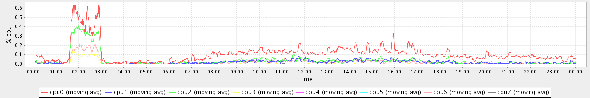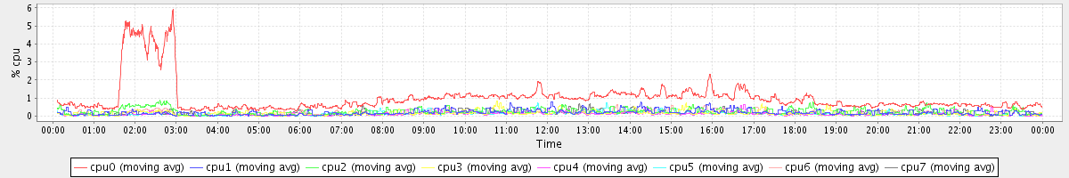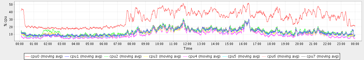 avg(cpu0) = 1.01 avg(cpu1) = 0.20 avg(cpu2) = 0.25 avg(cpu3) = 0.15 avg(cpu4) = 0.11 avg(cpu5) = 0.12 avg(cpu6) = 0.17 avg(cpu7) = 0.15
