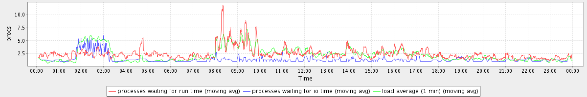 avg(processes waiting for run time) = 1.81 avg(processes waiting for io time) = 0.50 avg(load average (1 min)) = 2.25