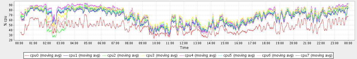 avg(cpu0) = 45.29 avg(cpu1) = 64.17 avg(cpu2) = 63.62 avg(cpu3) = 70.78 avg(cpu4) = 71.28 avg(cpu5) = 69.64 avg(cpu6) = 62.80 avg(cpu7) = 67.46