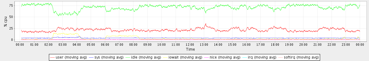 avg(user) = 21.59 avg(sys) = 3.90 avg(idle) = 71.06 avg(iowait) = 3.01 avg(nice) = 0.00 avg(irq) = 0.02 avg(softirq) = 0.39