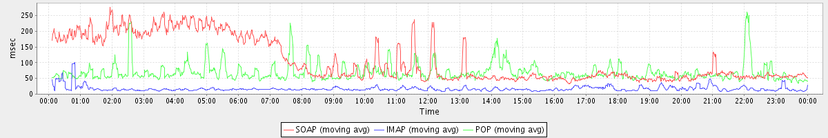 avg(FolderActionRequest.sync) = 13796.00 avg(BackupQueryRequest) = 603.40 avg(SyncGalRequest) = 3287.08 avg(SendInviteReplyRequest) = 668.77 avg(AutoCompleteRequest) = 564.63 avg(ContactActionRequest.delete) = 471.67 avg(ConvActionRequest.delete) = 760.90 avg(FolderActionRequest.empty) = 1497.00 avg(BackupRequest) = 4537.00 avg(GetQuotaUsageRequest) = 1004.00