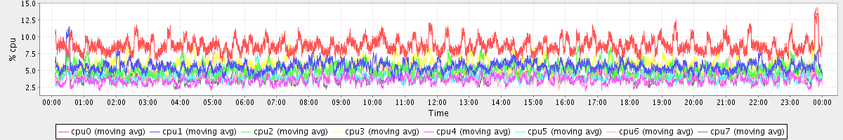 avg(cpu0) = 8.75 avg(cpu1) = 5.62 avg(cpu2) = 5.24 avg(cpu3) = 5.99 avg(cpu4) = 3.68 avg(cpu5) = 4.20 avg(cpu6) = 4.43 avg(cpu7) = 4.14