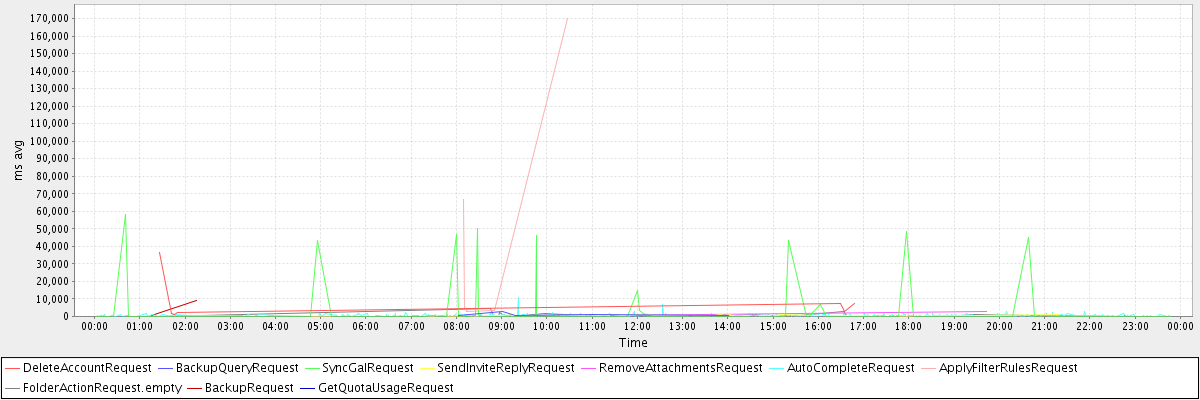 avg(DeleteAccountRequest) = 8391.43 avg(BackupQueryRequest) = 1208.60 avg(SyncGalRequest) = 2751.20 avg(SendInviteReplyRequest) = 476.31 avg(RemoveAttachmentsRequest) = 1703.50 avg(AutoCompleteRequest) = 505.02 avg(ApplyFilterRulesRequest) = 41930.33 avg(FolderActionRequest.empty) = 681.89 avg(BackupRequest) = 4831.50 avg(GetQuotaUsageRequest) = 2723.00