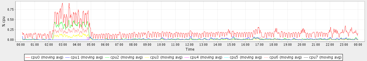 avg(cpu0) = 0.19 avg(cpu1) = 0.01 avg(cpu2) = 0.05 avg(cpu3) = 0.01 avg(cpu4) = 0.00 avg(cpu5) = 0.00 avg(cpu6) = 0.03 avg(cpu7) = 0.00