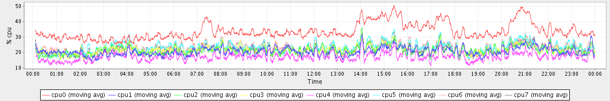 avg(cpu0) = 33.61 avg(cpu1) = 20.71 avg(cpu2) = 21.49 avg(cpu3) = 21.71 avg(cpu4) = 17.28 avg(cpu5) = 23.30 avg(cpu6) = 23.17 avg(cpu7) = 22.09