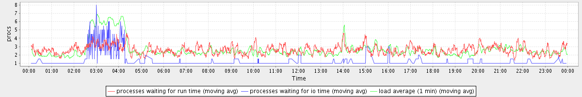 avg(processes waiting for run time) = 2.27 avg(processes waiting for io time) = 0.38 avg(load average (1 min)) = 2.63