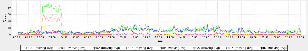 avg(cpu0) = 1.10 avg(cpu1) = 0.18 avg(cpu2) = 0.22 avg(cpu3) = 0.14 avg(cpu4) = 0.10 avg(cpu5) = 0.11 avg(cpu6) = 0.15 avg(cpu7) = 0.10