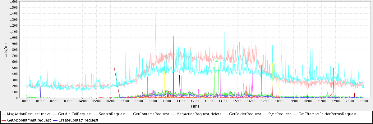 max(MsgActionRequest.move) = 540.00 max(GetMiniCalRequest) = 203.00 max(SearchRequest) = 640.00 max(GetContactsRequest) = 578.00 max(MsgActionRequest.delete) = 649.00 max(GetFolderRequest) = 1528.00 max(SyncRequest) = 924.00 max(GetEffectiveFolderPermsRequest) = 203.00 max(GetAppointmentRequest) = 1025.00 max(CreateContactRequest) = 382.00
