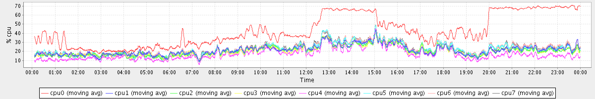 avg(cpu0) = 42.58 avg(cpu1) = 21.36 avg(cpu2) = 20.74 avg(cpu3) = 20.39 avg(cpu4) = 17.00 avg(cpu5) = 22.16 avg(cpu6) = 23.03 avg(cpu7) = 22.83