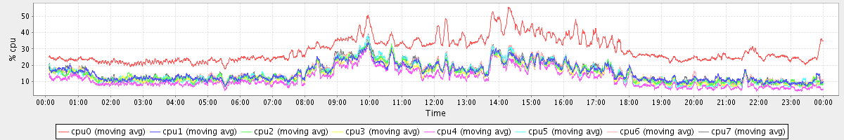 avg(cpu0) = 29.36 avg(cpu1) = 15.54 avg(cpu2) = 15.29 avg(cpu3) = 14.62 avg(cpu4) = 12.16 avg(cpu5) = 15.21 avg(cpu6) = 15.91 avg(cpu7) = 15.71
