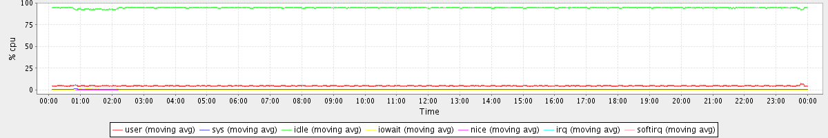 avg(user) = 4.80 avg(sys) = 0.47 avg(idle) = 94.57 avg(iowait) = 0.14 avg(nice) = 0.00 avg(irq) = 0.00 avg(softirq) = 0.00