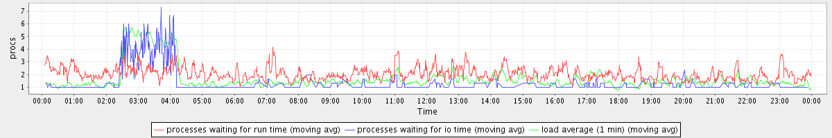 avg(processes waiting for run time) = 1.26 avg(processes waiting for io time) = 0.46 avg(load average (1 min)) = 1.65