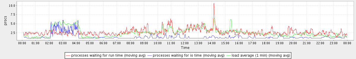 avg(processes waiting for run time) = 2.12 avg(processes waiting for io time) = 0.53 avg(load average (1 min)) = 2.51