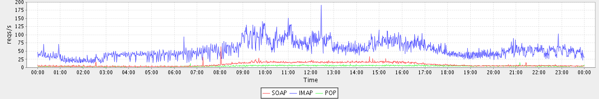 Host zm02.stanford.edu: Mailboxd: Request Rate by Client Protocol