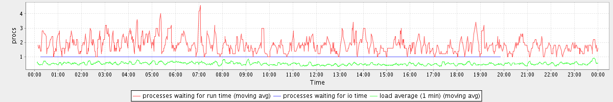 avg(processes waiting for run time) = 0.71 avg(processes waiting for io time) = 0.00 avg(load average (1 min)) = 0.52