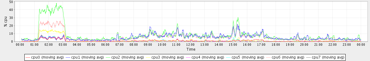 avg(cpu0) = 1.08 avg(cpu1) = 0.23 avg(cpu2) = 0.23 avg(cpu3) = 0.16 avg(cpu4) = 0.12 avg(cpu5) = 0.14 avg(cpu6) = 0.18 avg(cpu7) = 0.14
