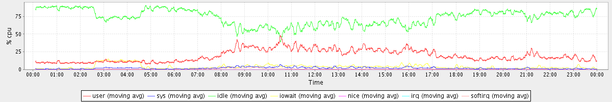 avg(user) = 19.57 avg(sys) = 2.04 avg(idle) = 73.55 avg(iowait) = 4.05 avg(nice) = 0.00 avg(irq) = 0.04 avg(softirq) = 0.75