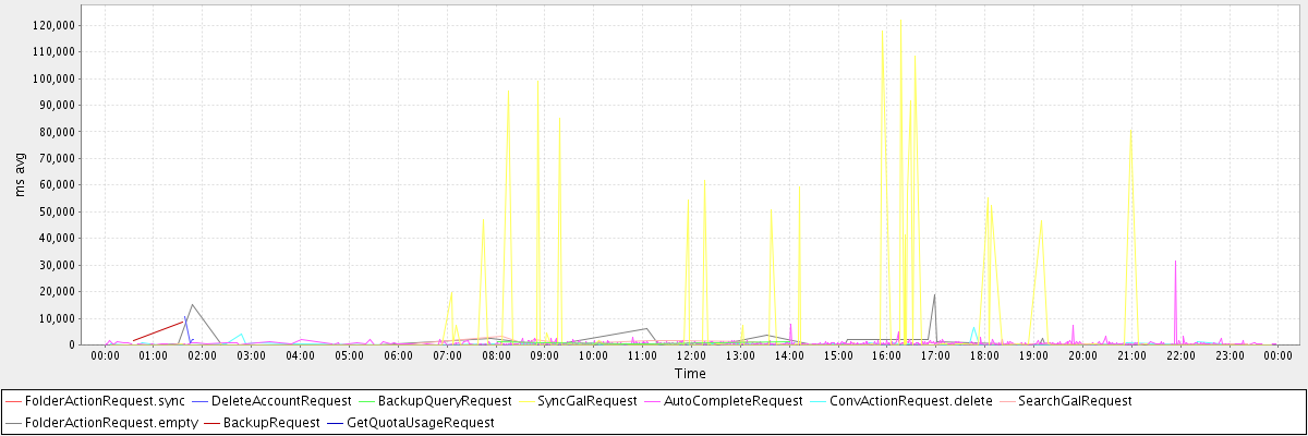 avg(FolderActionRequest.sync) = 6801.00 avg(DeleteAccountRequest) = 3975.50 avg(BackupQueryRequest) = 740.60 avg(SyncGalRequest) = 5804.63 avg(AutoCompleteRequest) = 580.91 avg(ConvActionRequest.delete) = 431.17 avg(SearchGalRequest) = 630.19 avg(FolderActionRequest.empty) = 2289.20 avg(BackupRequest) = 5014.00 avg(GetQuotaUsageRequest) = 2423.00