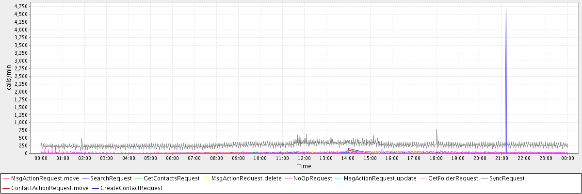 max(MsgActionRequest.move) = 136.00 max(SearchRequest) = 4670.00 max(GetContactsRequest) = 128.00 max(MsgActionRequest.delete) = 147.00 max(NoOpRequest) = 154.00 max(MsgActionRequest.update) = 112.00 max(GetFolderRequest) = 139.00 max(SyncRequest) = 779.00 max(ContactActionRequest.move) = 116.00 max(CreateContactRequest) = 164.00