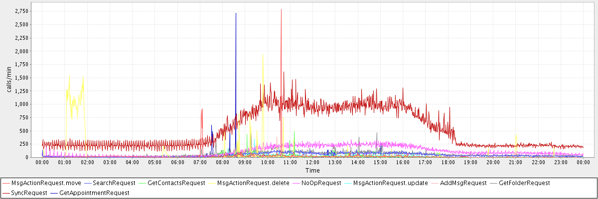 max(MsgActionRequest.move) = 2786.00 max(SearchRequest) = 149.00 max(GetContactsRequest) = 484.00 max(MsgActionRequest.delete) = 1940.00 max(NoOpRequest) = 338.00 max(MsgActionRequest.update) = 345.00 max(AddMsgRequest) = 382.00 max(GetFolderRequest) = 470.00 max(SyncRequest) = 1614.00 max(GetAppointmentRequest) = 2717.00