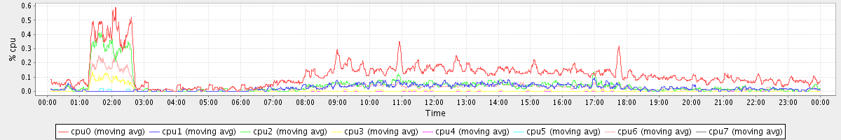 avg(cpu0) = 0.12 avg(cpu1) = 0.02 avg(cpu2) = 0.04 avg(cpu3) = 0.01 avg(cpu4) = 0.00 avg(cpu5) = 0.00 avg(cpu6) = 0.03 avg(cpu7) = 0.00