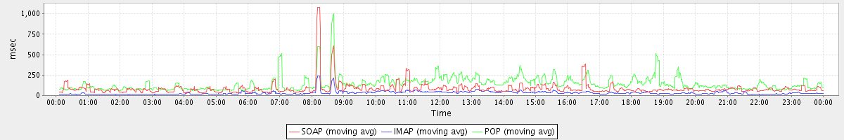 Host zm05.stanford.edu: Mailboxd: Response Time by Client Protocol