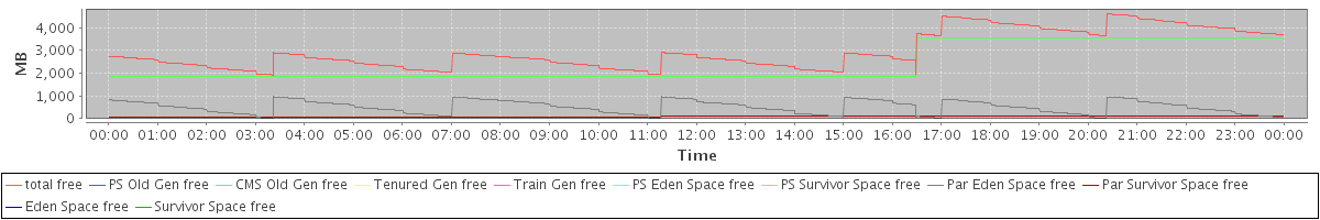 avg(total free) = 2973.77 avg(PS Old Gen free) = 0.00 avg(CMS Old Gen free) = 2380.79 avg(Tenured Gen free) = 0.00 avg(Train Gen free) = 0.00 avg(PS Eden Space free) = 0.00 avg(PS Survivor Space free) = 0.00 avg(Par Eden Space free) = 502.96 avg(Par Survivor Space free) = 90.02 avg(Eden Space free) = 0.00 avg(Survivor Space free) = 0.00