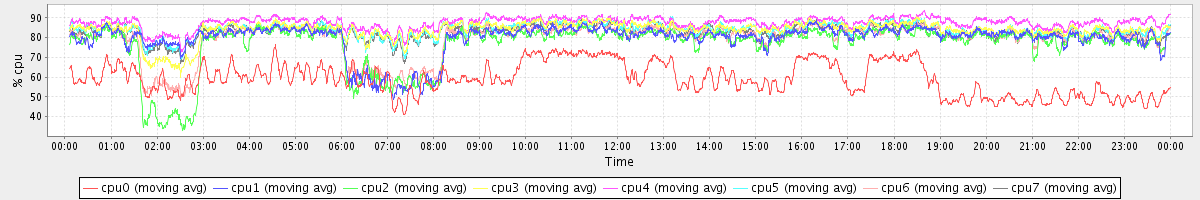 avg(cpu0) = 0.88 avg(cpu1) = 0.17 avg(cpu2) = 0.22 avg(cpu3) = 0.14 avg(cpu4) = 0.10 avg(cpu5) = 0.11 avg(cpu6) = 0.15 avg(cpu7) = 0.12