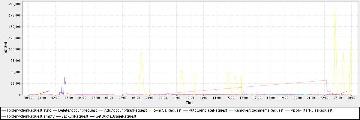 avg(FolderActionRequest.sync) = 6748.67 avg(DeleteAccountRequest) = 12347.00 avg(AddAccountAliasRequest) = 1631.00 avg(SyncGalRequest) = 3636.90 avg(AutoCompleteRequest) = 482.17 avg(RemoveAttachmentsRequest) = 2205.33 avg(ApplyFilterRulesRequest) = 9450.60 avg(FolderActionRequest.empty) = 1241.83 avg(BackupRequest) = 4981.00 avg(GetQuotaUsageRequest) = 2529.00