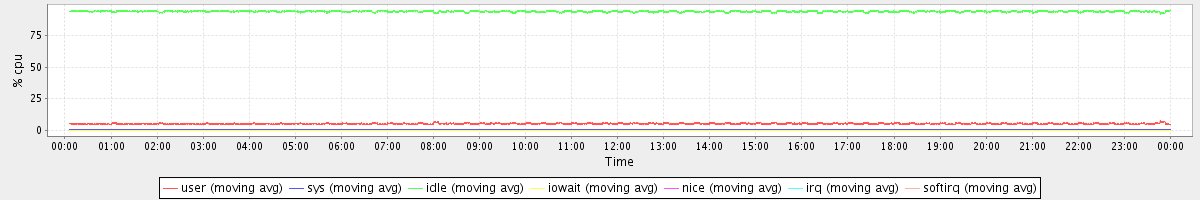 avg(user) = 5.25 avg(sys) = 0.57 avg(idle) = 94.15 avg(iowait) = 0.02 avg(nice) = 0.00 avg(irq) = 0.00 avg(softirq) = 0.00