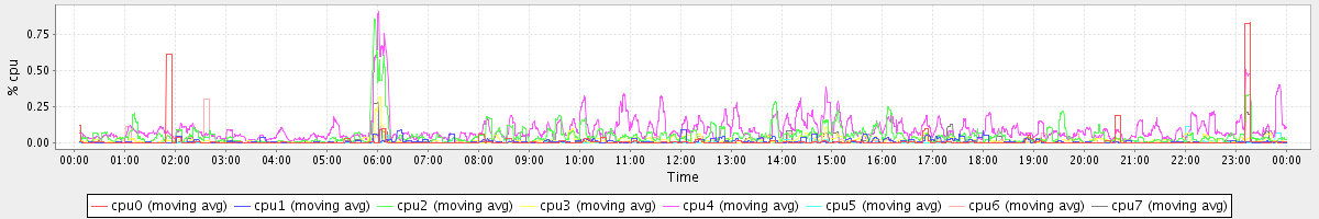 avg(cpu0) = 1.05 avg(cpu1) = 0.70 avg(cpu2) = 0.61 avg(cpu3) = 0.69 avg(cpu4) = 0.43 avg(cpu5) = 0.41 avg(cpu6) = 0.32 avg(cpu7) = 0.30