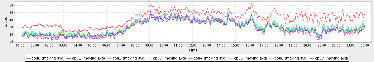 avg(cpu0) = 2.26 avg(cpu1) = 1.57 avg(cpu2) = 1.56 avg(cpu3) = 1.58 avg(cpu4) = 1.31 avg(cpu5) = 1.56 avg(cpu6) = 1.56 avg(cpu7) = 1.59
