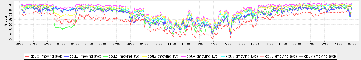 avg(cpu0) = 37.39 avg(cpu1) = 19.01 avg(cpu2) = 18.82 avg(cpu3) = 18.08 avg(cpu4) = 16.52 avg(cpu5) = 19.80 avg(cpu6) = 20.65 avg(cpu7) = 20.16