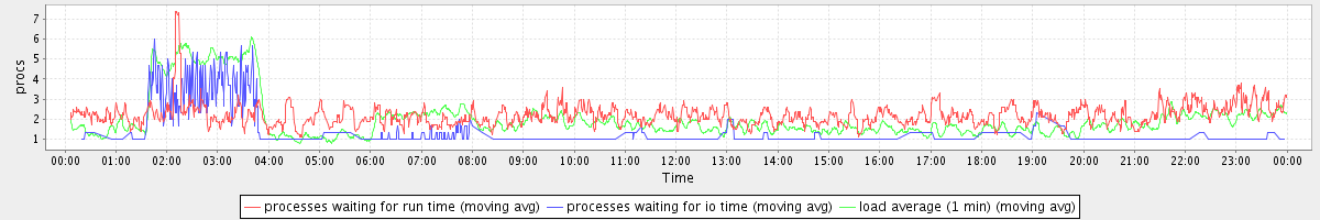 avg(processes waiting for run time) = 1.58 avg(processes waiting for io time) = 0.45 avg(load average (1 min)) = 2.00