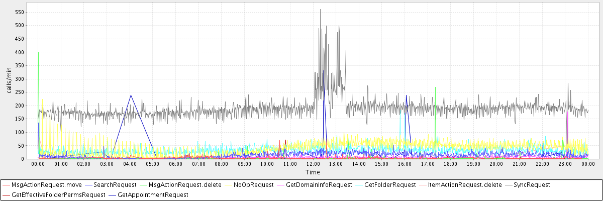max(MsgActionRequest.move) = 73.00 max(SearchRequest) = 135.00 max(MsgActionRequest.delete) = 399.00 max(NoOpRequest) = 224.00 max(GetDomainInfoRequest) = 177.00 max(GetFolderRequest) = 182.00 max(ItemActionRequest.delete) = 90.00 max(SyncRequest) = 560.00 max(GetEffectiveFolderPermsRequest) = 71.00 max(GetAppointmentRequest) = 331.00