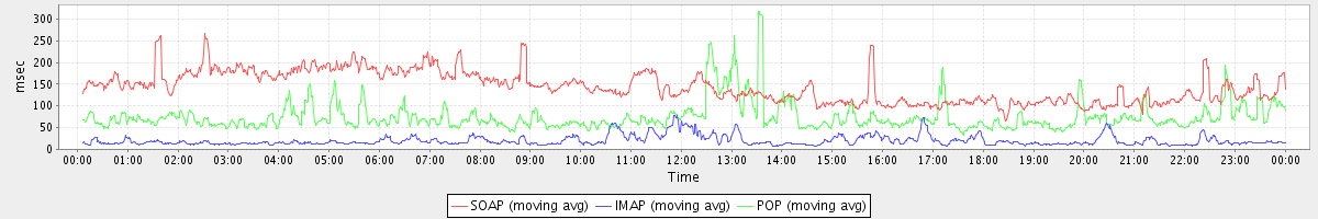 avg(AutoCompleteGalRequest) = 480.58 avg(DeleteAccountRequest) = 2565.00 avg(GetFreeBusyRequest) = 725.00 avg(SyncGalRequest) = 473.58 avg(FlushCacheRequest) = 598.50 avg(AutoCompleteRequest) = 459.83 avg(ApplyFilterRulesRequest) = 111830.00 avg(FolderActionRequest.empty) = 3670.59 avg(BackupRequest) = 4538.00 avg(GetQuotaUsageRequest) = 956.00