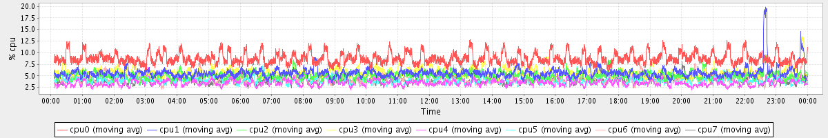 avg(cpu0) = 8.81 avg(cpu1) = 5.64 avg(cpu2) = 5.15 avg(cpu3) = 5.81 avg(cpu4) = 3.56 avg(cpu5) = 4.17 avg(cpu6) = 4.33 avg(cpu7) = 4.13