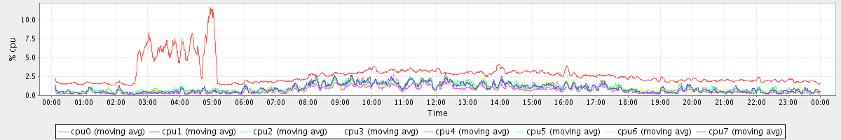 avg(cpu0) = 0.35 avg(cpu1) = 0.06 avg(cpu2) = 0.09 avg(cpu3) = 0.01 avg(cpu4) = 0.00 avg(cpu5) = 0.00 avg(cpu6) = 0.07 avg(cpu7) = 0.00