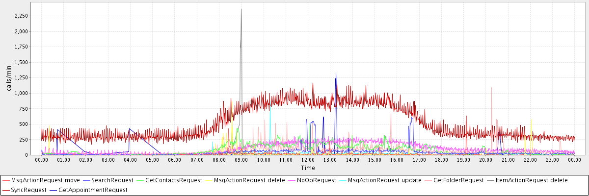 max(MsgActionRequest.move) = 636.00 max(SearchRequest) = 620.00 max(GetContactsRequest) = 517.00 max(MsgActionRequest.delete) = 860.00 max(NoOpRequest) = 309.00 max(MsgActionRequest.update) = 879.00 max(GetFolderRequest) = 1091.00 max(ItemActionRequest.delete) = 2358.00 max(SyncRequest) = 1164.00 max(GetAppointmentRequest) = 1324.00