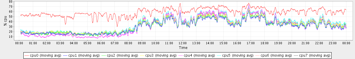 avg(cpu0) = 1.40 avg(cpu1) = 0.23 avg(cpu2) = 0.27 avg(cpu3) = 0.20 avg(cpu4) = 0.15 avg(cpu5) = 0.21 avg(cpu6) = 0.22 avg(cpu7) = 0.16