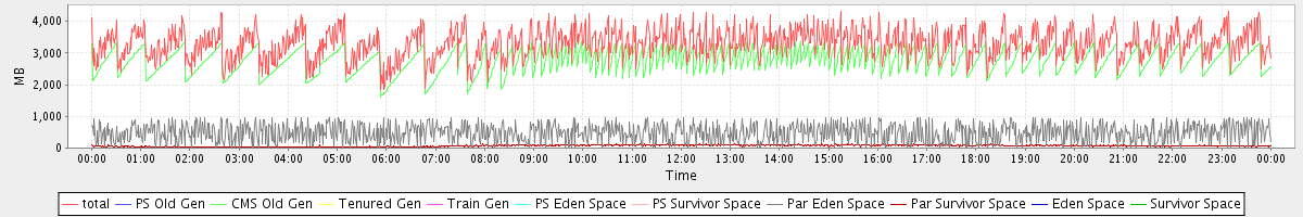 avg(total) = 3294.72 avg(PS Old Gen) = 0.00 avg(CMS Old Gen) = 2747.60 avg(Tenured Gen) = 0.00 avg(Train Gen) = 0.00 avg(PS Eden Space) = 0.00 avg(PS Survivor Space) = 0.00 avg(Par Eden Space) = 479.23 avg(Par Survivor Space) = 67.89 avg(Eden Space) = 0.00 avg(Survivor Space) = 0.00