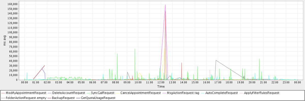 avg(ModifyAppointmentRequest) = 1220.42 avg(DeleteAccountRequest) = 13228.00 avg(SyncGalRequest) = 1079.17 avg(CancelAppointmentRequest) = 1347.07 avg(MsgActionRequest.tag) = 2669.75 avg(AutoCompleteRequest) = 891.12 avg(ApplyFilterRulesRequest) = 11859.50 avg(FolderActionRequest.empty) = 2316.33 avg(BackupRequest) = 15731.00 avg(GetQuotaUsageRequest) = 1112.00