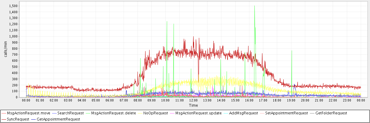 max(MsgActionRequest.move) = 191.00 max(SearchRequest) = 143.00 max(MsgActionRequest.delete) = 1501.00 max(NoOpRequest) = 371.00 max(MsgActionRequest.update) = 195.00 max(AddMsgRequest) = 287.00 max(SetAppointmentRequest) = 256.00 max(GetFolderRequest) = 197.00 max(SyncRequest) = 1001.00 max(GetAppointmentRequest) = 215.00