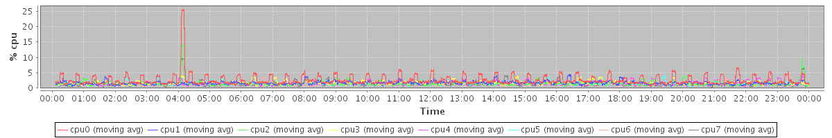 avg(cpu0) = 0.43 avg(cpu1) = 0.29 avg(cpu2) = 0.22 avg(cpu3) = 0.22 avg(cpu4) = 0.24 avg(cpu5) = 0.17 avg(cpu6) = 0.14 avg(cpu7) = 0.11