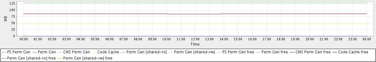 avg(PS Perm Gen) = 0.00 avg(Perm Gen) = 0.00 avg(CMS Perm Gen) = 126.94 avg(Code Cache) = 47.50 avg(Perm Gen [shared-ro]) = 0.00 avg(Perm Gen [shared-rw]) = 0.00 avg(PS Perm Gen free) = 0.00 avg(Perm Gen free) = 0.00 avg(CMS Perm Gen free) = 84.97 avg(Code Cache free) = 0.31 avg(Perm Gen [shared-ro] free) = 0.00 avg(Perm Gen [shared-rw] free) = 0.00
